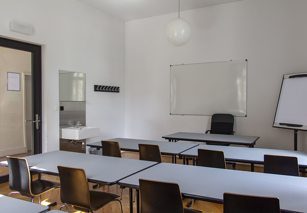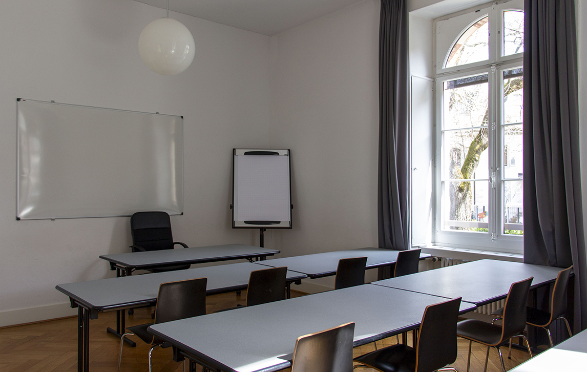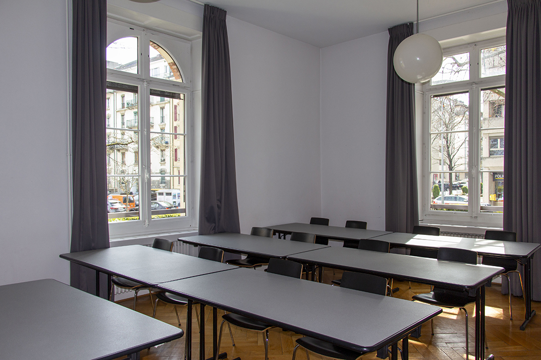 La salle Rousseau, située au rez-de-chaussée du bâtiment historique du Geneva Hostel, offre un cadre idéal pour des réunions intimes ou des ateliers. Cette salle bénéficie d'une lumière naturelle abondante et offre une vue directe sur un jardin paisible, créant une atmosphère calme et inspirante. Équipée d'un tableau blanc, d'un flipchart et d'un projecteur (beamer), elle permet une variété de présentations et de collaborations efficaces.